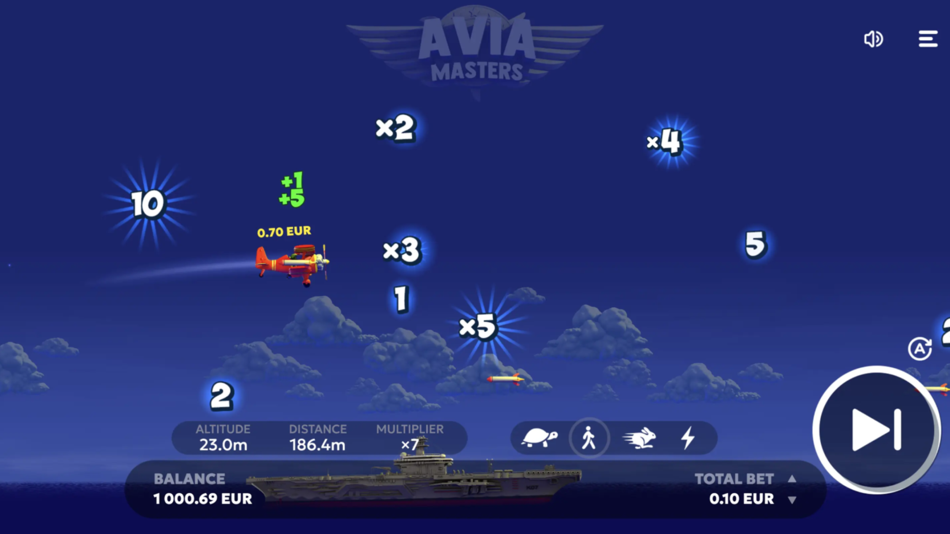 Το παιχνίδι ξεκινάει με τον παίκτη να ποντάρει το ποσό που επιθυμεί, ξεκινώντας από 0.10€. Όταν πατήσετε το κουμπί της έναρξης, το αεροπλάνο θα ξεκινήσει σε αυτόματο πιλότο την πορεία του, και ο σκοπός είναι να συλλέξετε πολλαπλασιαστές με μέγιστο συνολικό πολλαπλασιαστή x250. Υπάρχουν 4 ταχύτητες με τις οποίες μπορεί να κινείται το αεροπλάνο, και είναι μέρος της στρατηγικής σας πως επιλέξετε να τις εναλλάσετε. Εάν το αεροπλάνο συγκρουστεί με κάποιον από τους αιωρούμενους πυραύλους, το αεροπλάνο θα χάσει ύψος και οι πόντοι θα μειωθούν στους μισούς. Ένα έξυπνο ποντάρισμα, η σωστή διαχείριση των ταχυτήτων και εξάσκηση στο Aviamasters demo περιβάλλον, θα σας βοηθήσουν να καταλάβετε και να απολαύσετε το παιχνίδι.